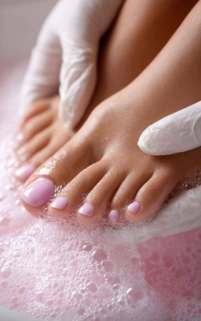 Limpieza del pie en agua con sales esenciales, remoción de cuticulas y durezas, limado, exfoliación, esmaltado en semipermanente e hidratación.